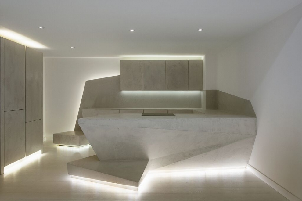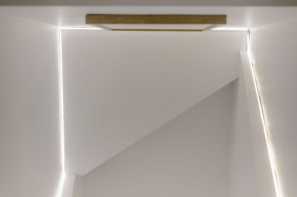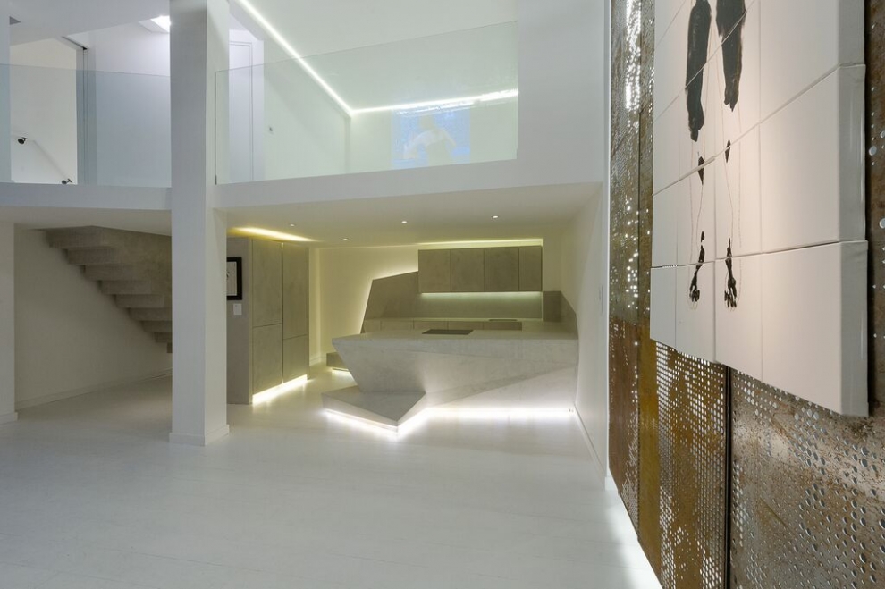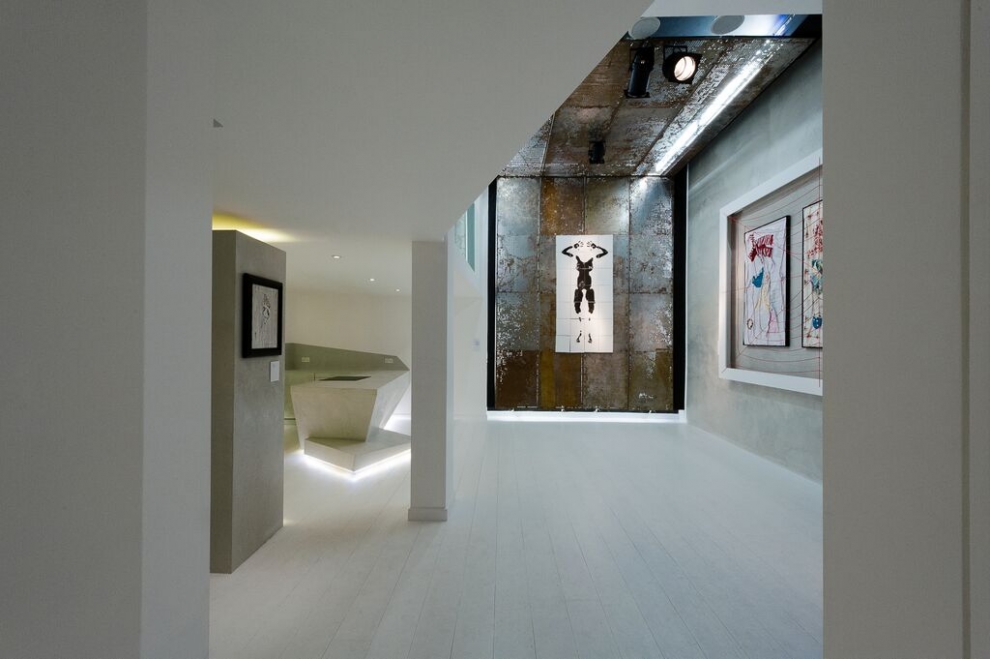 The stark white interior of the central room is contrasted by a metal wall piece, delicately backlit by LED lights, all adding to the ambiance of creative mystery.