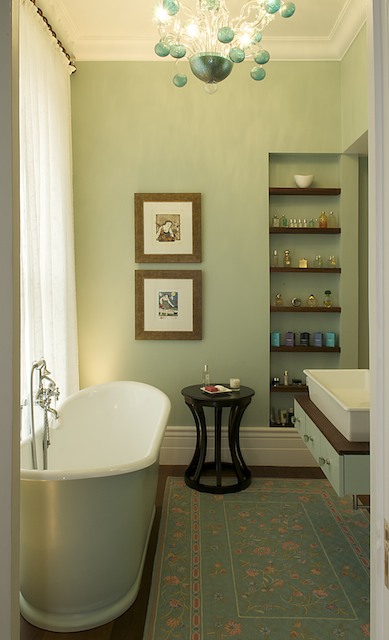 In the main bathroom 4M created a high-spec scheme, stripping the bathroom tiles to be replaced with sustainable Ipe wood flooring, a Murano glass chandelier, and a free standing bathtub.