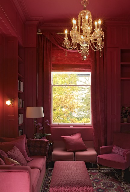 The use of such extreme contrast of colour debunks the myth that bold colours make rooms feel small. In fact, quite the contrary - by not breaking the lines with a white ceiling, or window frames, the single colour deepens the mood and evokes a lively sensation.