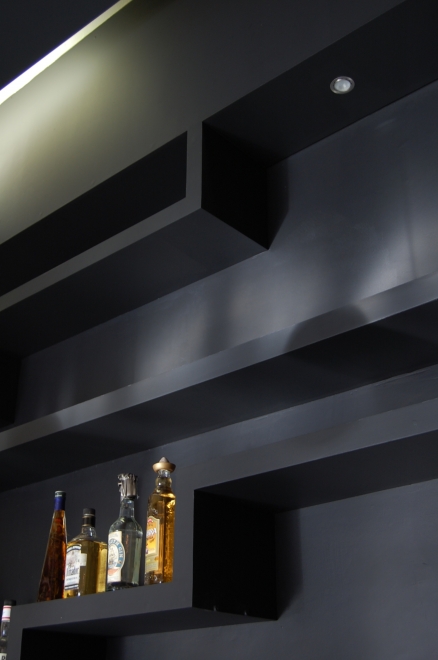Above, the ceiling draws a deep dramatic charcoal - a stark contrast with the otherwise ivory interior. Only the fenestration edges carry the charcoal colour to the floor, which also provides the border for the double height feature windows , that multi-function as sliding panels to open up onto the pavement - the ideal setting to dew the wine glasses on a warm summers evening.