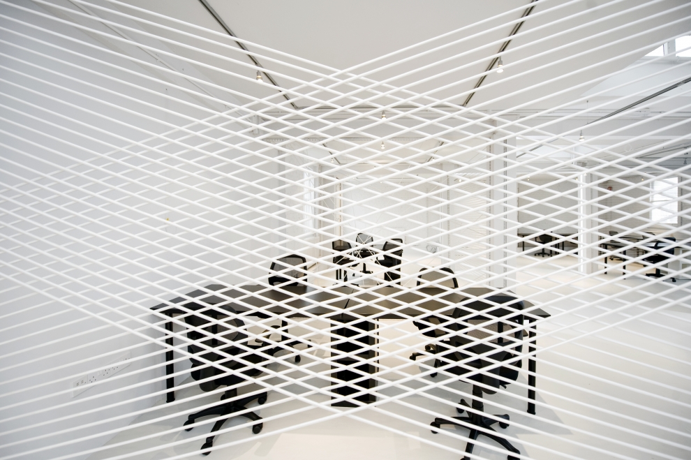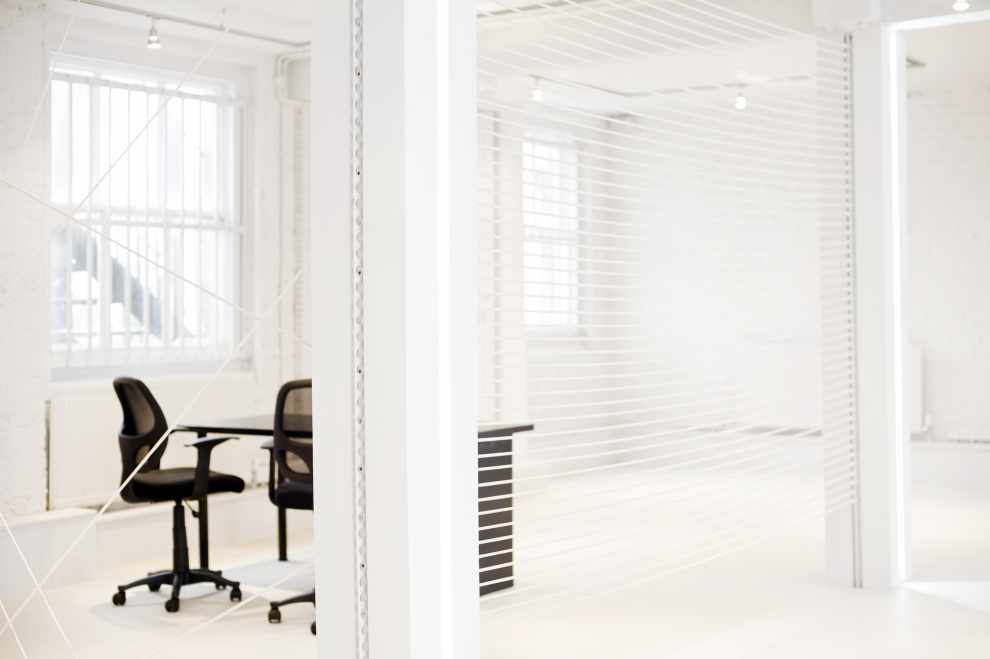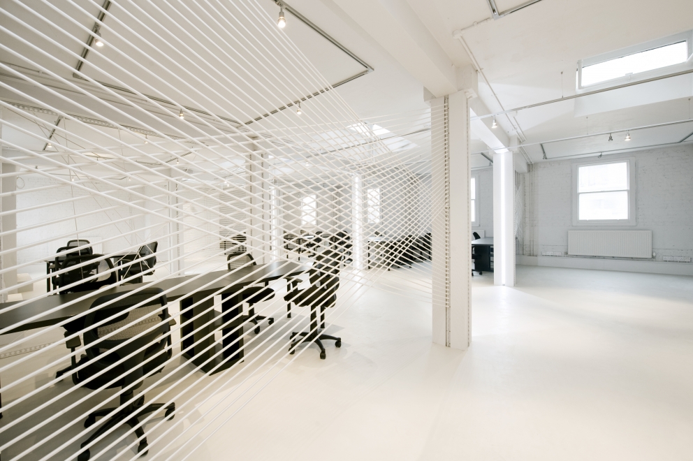 At the heart of the design, and interlocking mesh of bungee cords were clasped and suspended between its walls, to act as the axis to perpendicular partitions, morphing the old into the new.