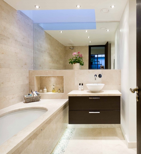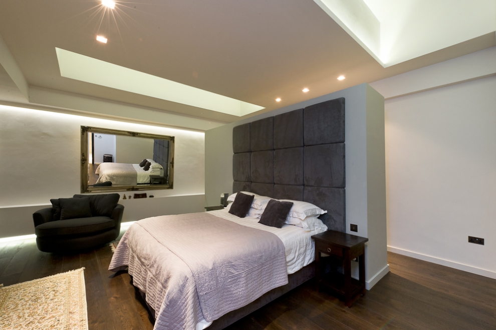 In the master-bedroom cut out ceiling windows and a glowing border lights, frames the room in a way that creates an atmosphere of intimacy and relaxation. A velvet cushioned wall acts as a partition, to hide the bed from the rest of the room, allowing ample space for entry to the custom made wardrobe behind, full of nifty gadget of organisational genius. Adjacent to the bedroom, the master en suite bathroom is dressed with Crema Marfil marble, which is accentuated with atmospheric lighting that would rival the stature of any five-star luxury spa-room.