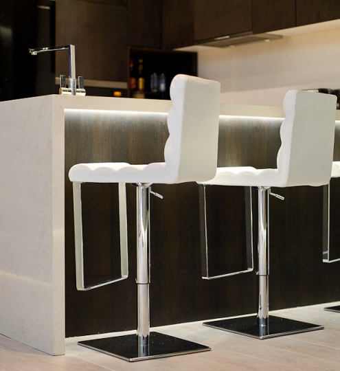 The kitchen, the most social place in the home, was created so that it can be used for either cooking or as an ideal place for merely sitting and chatting with friends. The white granite counter top provides a refreshing contrast to the dark cabinetry, and the integrated home appliances and stainless steel sink make sensible use of space to avoid any visual clutter.