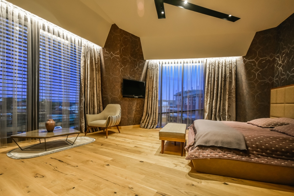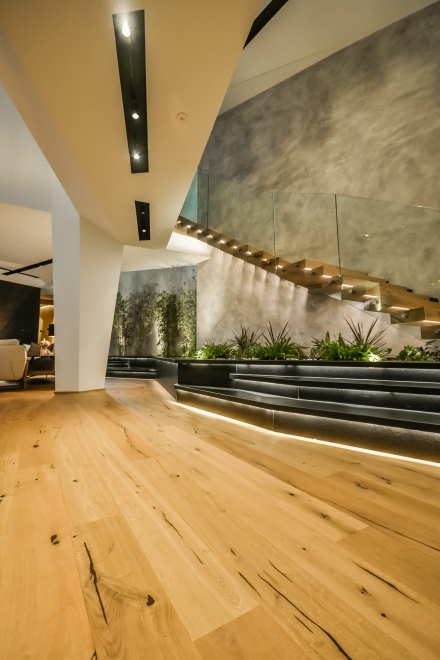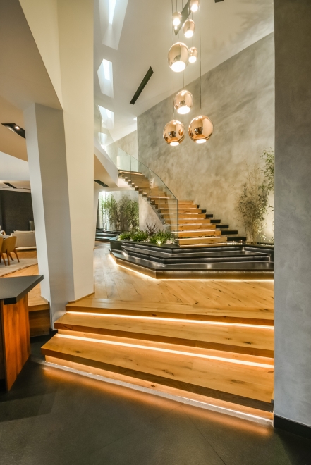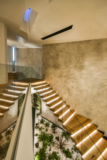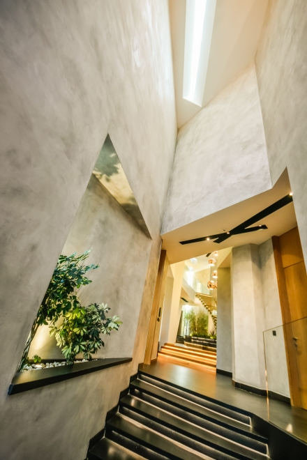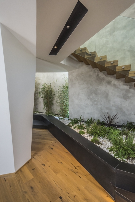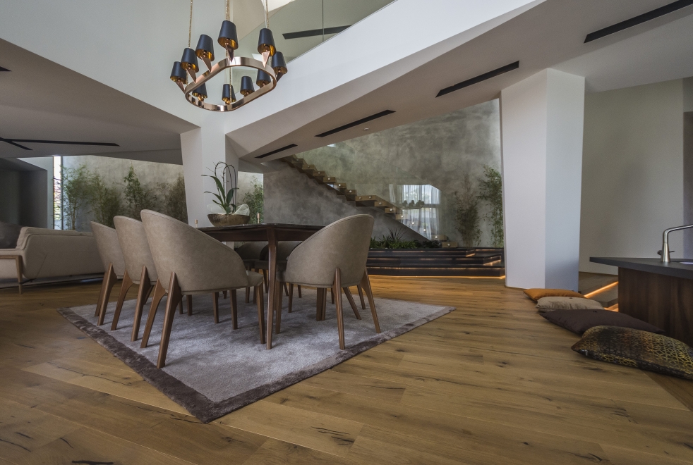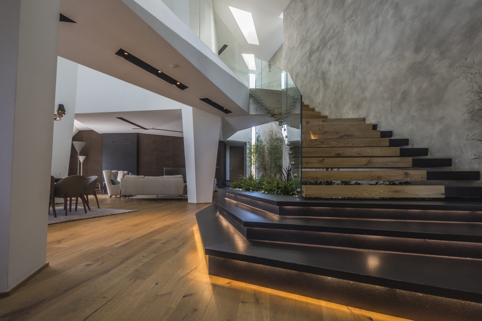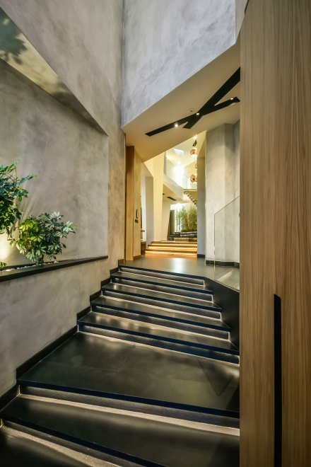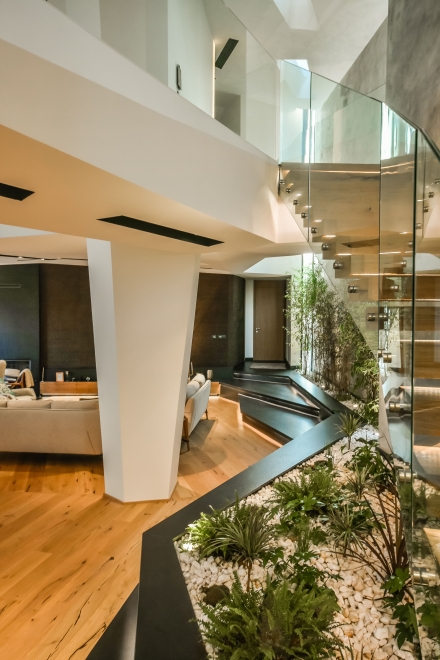With orientation and natural illumination meticulously planned, large south- and west-facing windows provide atmospheric corners and astonishing focal points that draw the eyes into specific areas during any time of day. The intersection of planes, walkways and stairs encourage social encounters and visual exploration within a sprawling space of 850 sq.m. Areas dissolve into one another-- from the private outdoors of its gardens through to the surreal landscape within the contemporary mansion, the home’s interior becomes an extension of its exterior, connecting with nature to breathe in surrounding life.