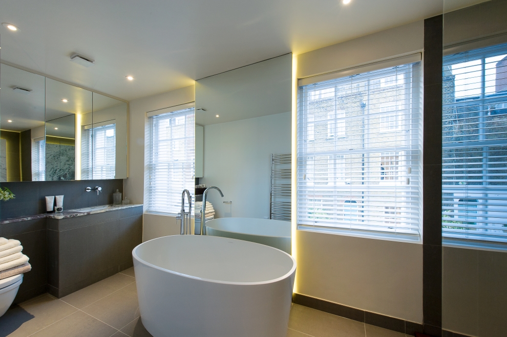 On the top level lies the master bedroom, restfully gleaning of cosy comfort – walnut wood and faux crocodile lining the bespoke walk-in-closet.