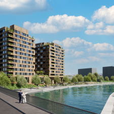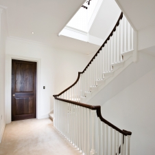 Throughout the apartment, engineered oak flooring spans all but the bathroom floor, which bears cut to size black honed granite. Within this bathroom, the walls are lined with large pieces of back painted glass to form a turquoise colour scheme, projecting diamond -esque reflections of luminous flow throughout the shower borders.