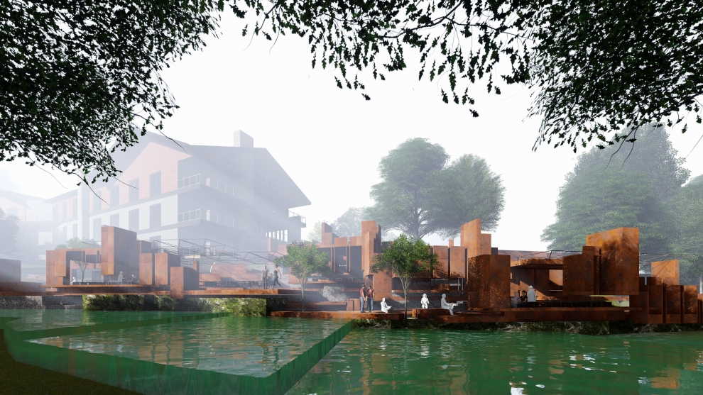 Riverside The area near the river is conceived as a composition of fragmented sculptural volumes. The volumes are created from tile elements and wooden beam / pillar, in combination with rustic metal and vertical and horizontal glass panels, to allow contact with the surrounding environment, and not just the river side. This composition will encourage sitting on the other side of the terrace as well. The composition also encourages use in wider areas for larger groups of guests. Capacity of 72 tables / 362 seats.