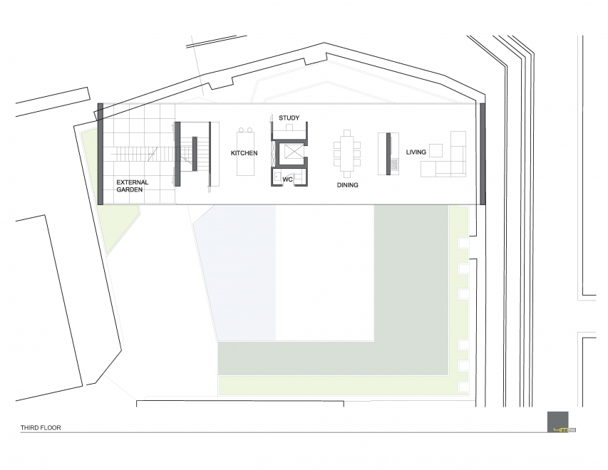 The monolithic living space stretches out towards the city, making it seem as if it is suspended in air, and reaching out for it all. |