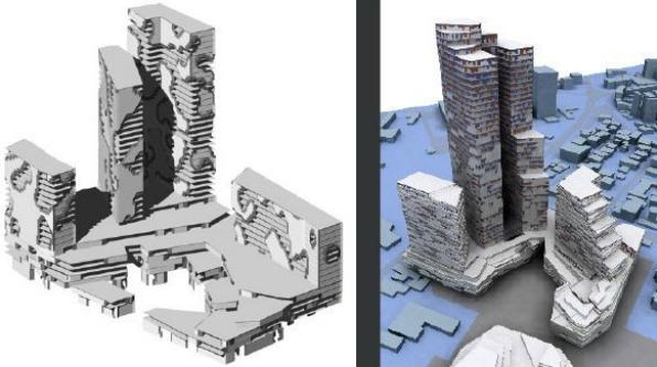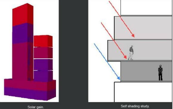 Sunlight/Orientation: This programme analyses the local solar climate condition and modifies the solar gain values of each panel, which has already had the overshadowing value added to it. This summed value is affected by the function of the specific floor the panel sits on. This data is also extrapolated into a self shading mechanism, whereby the surfaces will be extruded subsequently casting shadows onto lower or adjacent surfaces.