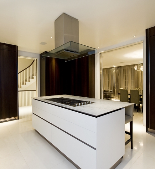 The interior design and materials used were a mixture of both 4M bespoke and manufactured. In the kitchen, whist the floor marvelled with immaculate French white limestone – the doors and joinery elements were all designed and created especially to fit the house. Similarly, on the master bedroom level, the bath was created using book matched Calcutta stone which was selected on the quarry.